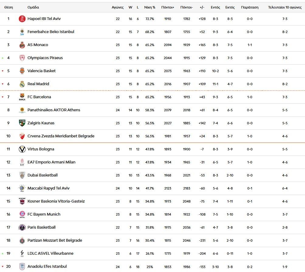 Euroleague: Κάθοδος για τον Παναθηναϊκό, άνοδος για τον Ολυμπιακό