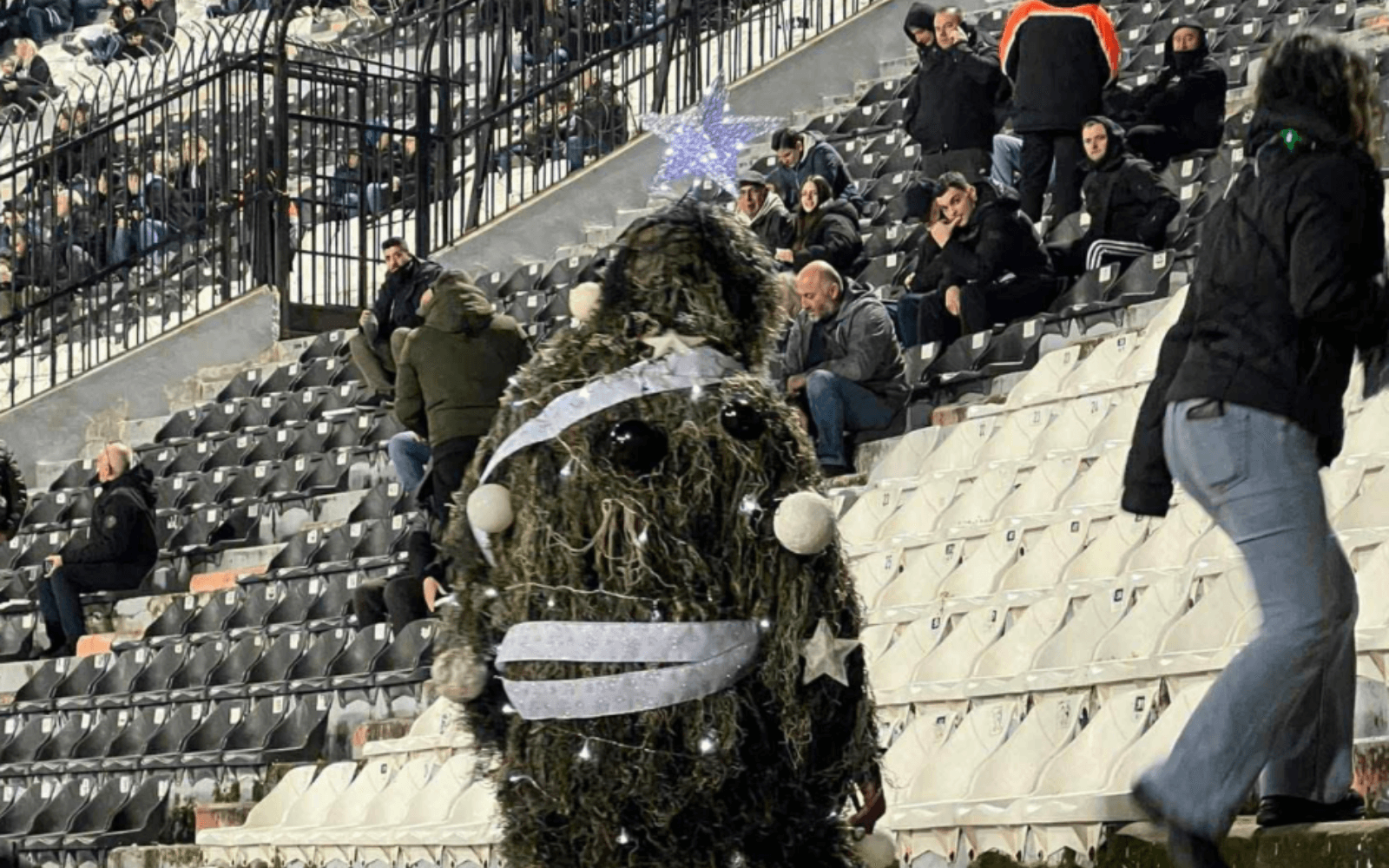 Έκπληξη προκάλεσε ένα κινούμενο... δέντρο στις κερκίδες της Τούμπας, καθώς φίλος του "Δικεφάλου" φόρεσε στολή έλατου